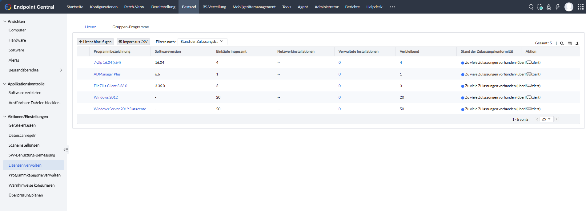 Die Lizenzmanagement-Funktionen in Endpoint Central (ehemals Desktop Central) unterstützen Administratoren dabei, Probleme mit Software-Lizenzen und unnötige Kosten durch Überlizensierung zu vermeiden. Die Grundlage für diese einfache Lizenzverwaltung schafft das Software Inventory in Endpoint Central: Dort lassen sich die entsprechenden Lizenzen direkt mit den jeweiligen Software-Instanzen verknüpfen. Bei jeder Aktualisierung des IT-Inventars überprüft Endpoint Central, ob diese mit den Lizenzbedingungen übereinstellen, erstellt Berichte und alarmiert bei Über- oder Unterlizenzierung.