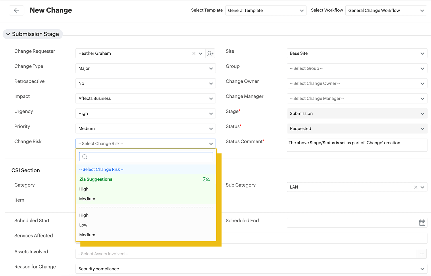 Zia leitet Tickets automatisch an die richtigen Techniker oder Gruppen weiter, basierend auf Vorhersagen des zur Lösung erforderlichen Fachwissens sowie deren Auslastung. - Risikobewertung von Changes: