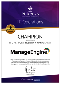 ManageEngine wurde im Rahmen des „Professional User Rating (PUR) – IT Operations 2026“ des Research- und Analystenhauses techconsult als „Champion“ im Lösungsbereich „IT & Network Inventory Management“ ausgezeichnet.