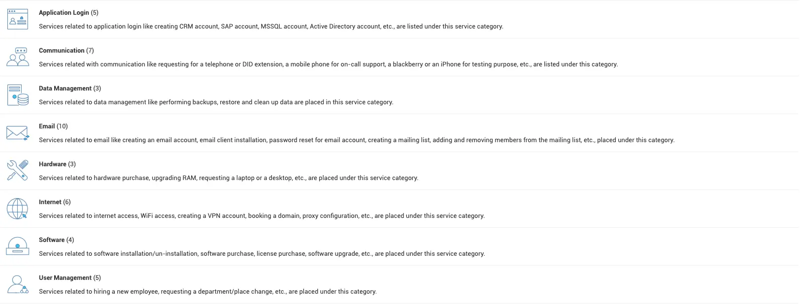 Als nächstes sollten Sie Ihre Services definieren und kategorisieren. Eine durchdachte Kategorisierung erleichtert es den Endanwendern, die benötigten Dienste schnell und einfach zu finden und anzufordern. Machen Sie dazu am besten eine Bestandsaufnahme aller von der IT-Abteilung angebotenen Services, der zur Serviceerbringung durchgeführten Arbeitsabläufe und die für jeden einzelnen Service erforderliche Bearbeitungszeit.