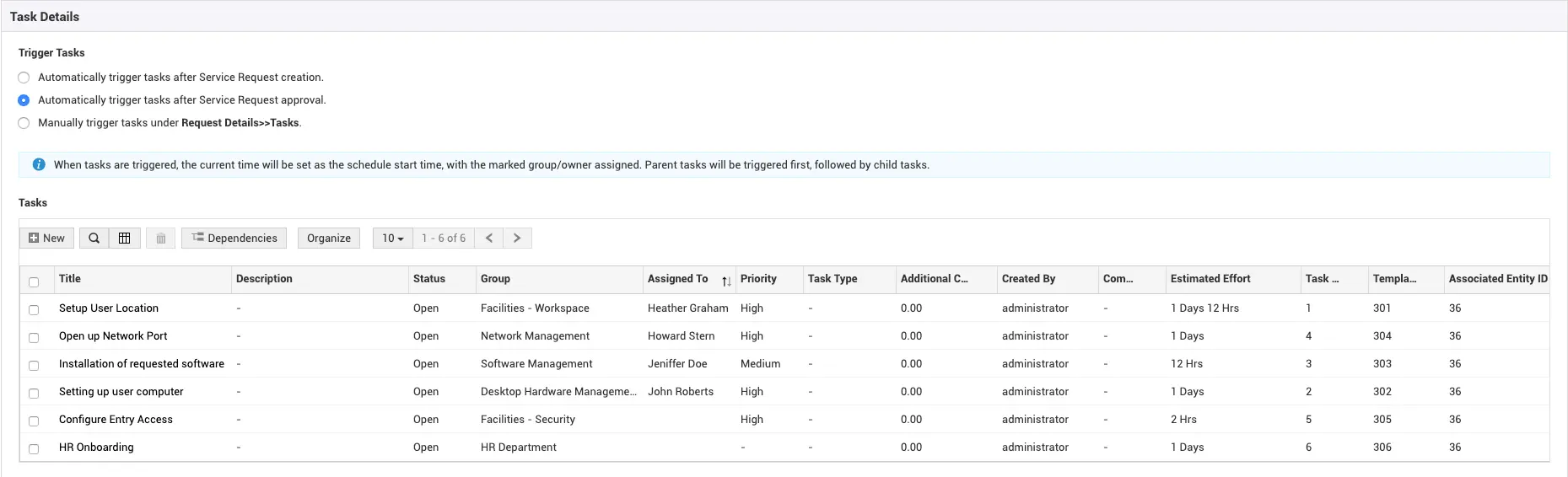 In der Servicevorlage können Sie für einen bestimmten Service wie das Mitarbeiter-Onboarding mehrere Aufgaben konfigurieren, organisieren und ggf. Abhängigkeiten festlegen. Sie können zudem festlegen, ob Aufgaben für den Antragsteller sichtbar sein sollen, wann Aufgaben hinzugefügt werden sollen (nach der Antragerstellung oder nach der Genehmigung) und den Zeitpunkt für das Auslösen von Aufgaben festlegen (nach der Antragserstellung, nach der Genehmigung oder manuell).